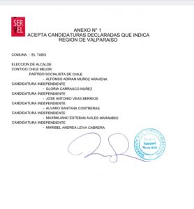 Me permito publicar la nómina oficial de candidatos a alcalde de El Tabo, aceptados por SERVEL para las Elecciones Municipales 2024.